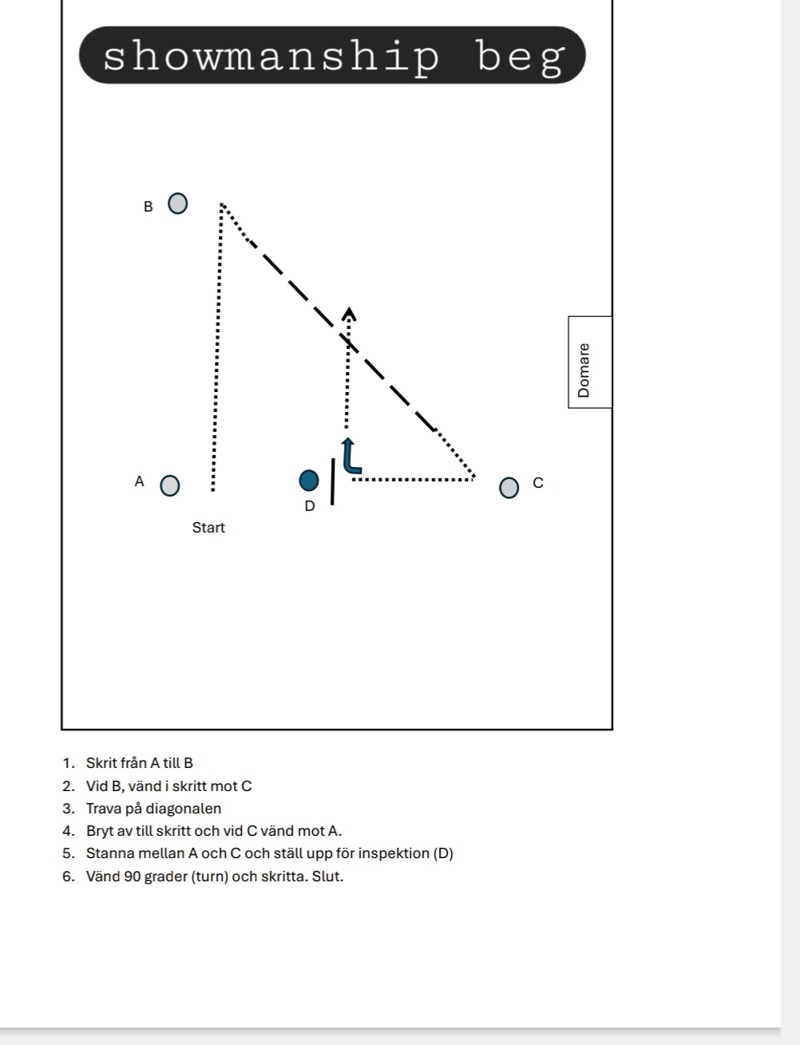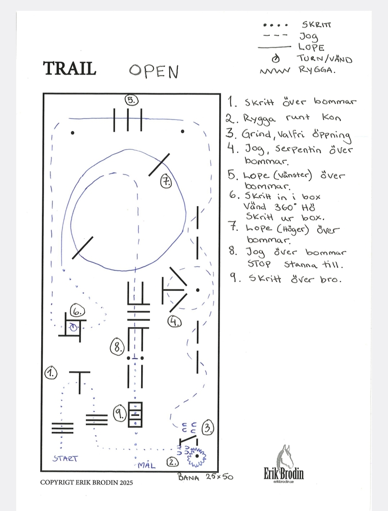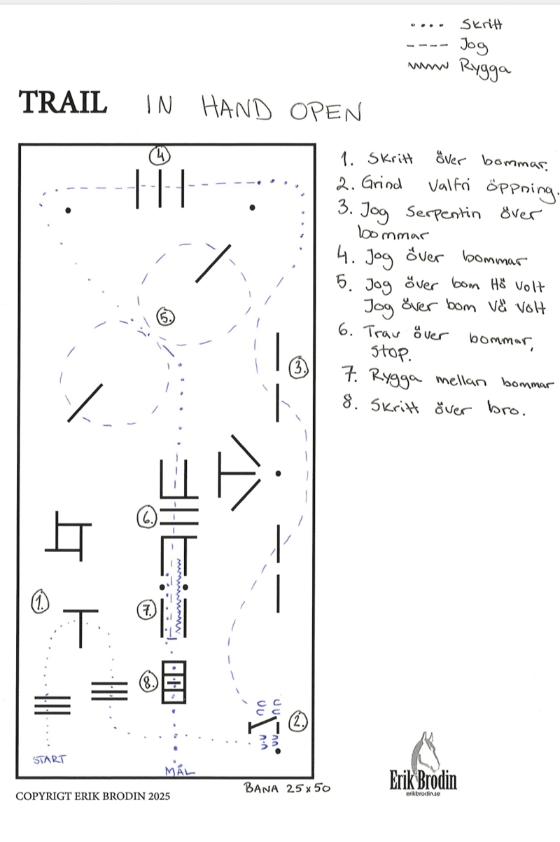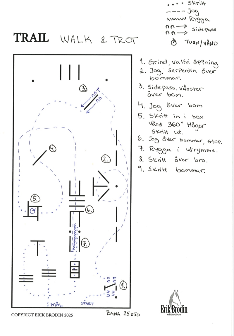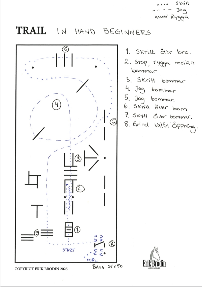 I trail beg och w&t får man först gå banan med domare och sen gå 1 varv ytterkant på banan med häst vid behov.
