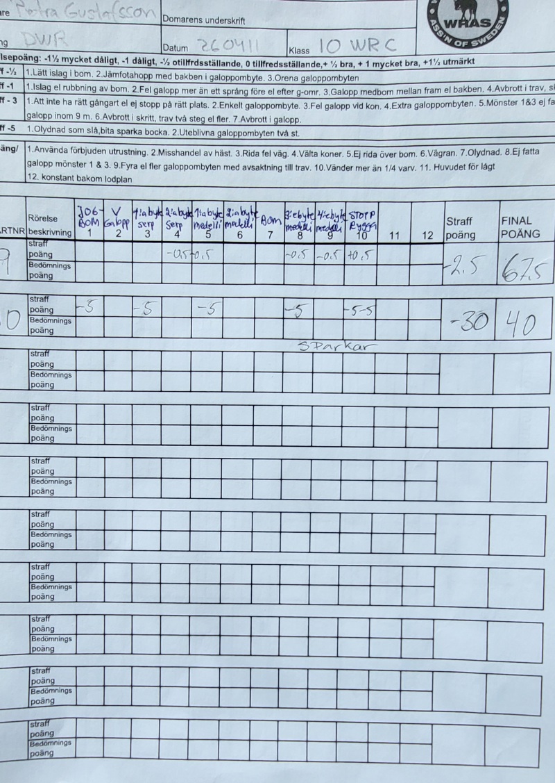 Vid ändring av häst/ryttare/klass efter anmälningstidens utgång, uttages en avgift på 100:- Återbetalning sker endast mot uppvisande av Läkar- eller Veterinärintyg, med ett avdrag på 100:- i admin.avg. Intyg ska vara inlämnat senast 18 maj 2026.