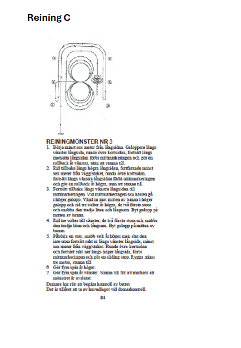 | 21 | Reining D Open | 15 minuters uppvärmning i ridhuset innan den här klassen. Alla reiningekipage samtidigt oavsett klass. OBS! Problem med filer i tävlingssystemet. Samma mönster (Reiningmönster 12) som klass 12, Reining E. | 150,- | 120,- | 4 | ||||||||||||||